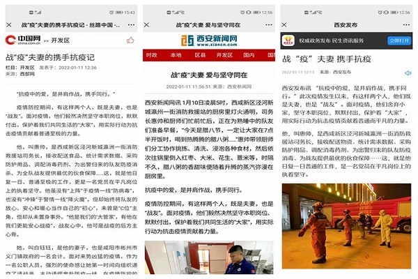 现场出警救援解民困。中国消防官方抖音号以《一群“大白”路遇车祸,现场出警》为题转发西咸消防抗“疫”途中紧急出警救援视频。在陕广新闻开展《西咸消防出警归队全面核酸检测和防疫消杀》直播,搜狐新闻、陕西都市快报分别报道《消防员抗疫途中遇车祸十分钟救出2人#竟是为隔离酒店送餐的志愿者》,话题“大白变身消防员解救出车祸人员”冲上当日抖音同城热搜TOP榜,获356.9万点赞量。