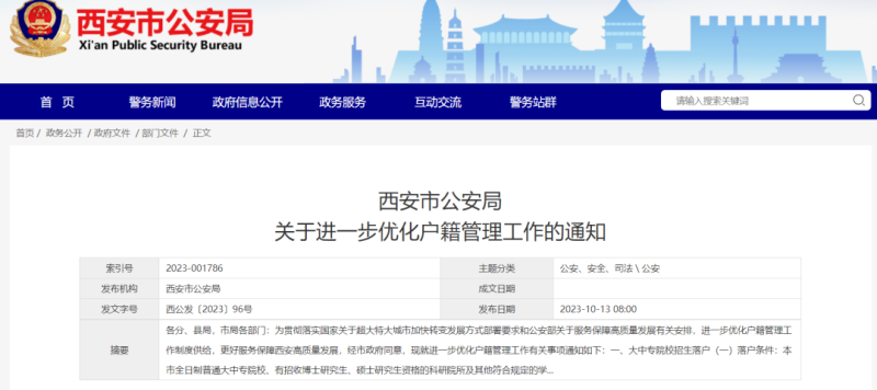 今日,西安市公安局发布关于进一步优化户籍管理工作的通知。