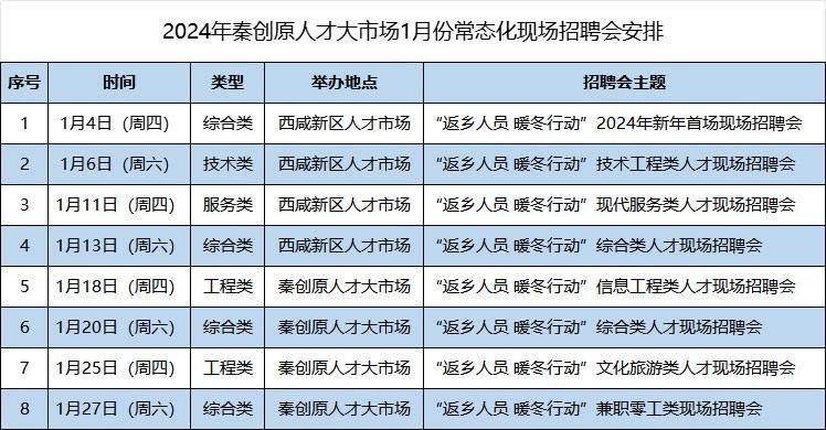 一元复始 万象更新,才聚西咸 企盼您来,新年首月 秦创原人才大市场将举办8场不同主题类型现场招聘会,满足各企事业单位和广大求职者双选需求,具体安排如下:
