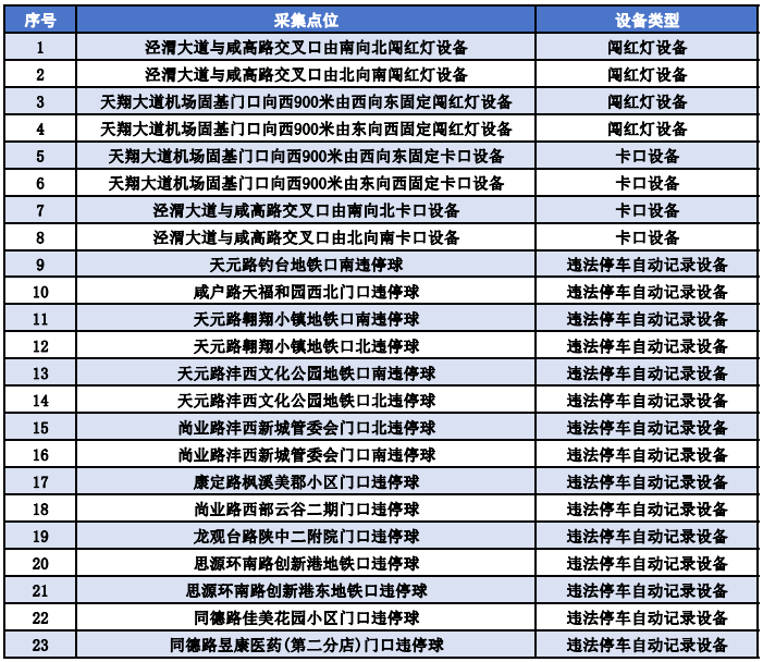 为进一步加强西咸新区重点道路交通管理,优化道路通行环境,预防和减少道路交通事故发生,保障广大人民群众的生命财产安全,根据《中华人民共和国道路交通安全法》、《中华人民共和国道路交通安全法实施条例》等法律法规的有关规定,结合西咸辖区道路交通实际,现决定自2024年5月6日零时起正式启用以下23处交通违法抓拍取证设备,现将新增道路交通违法采集点位公示如下: