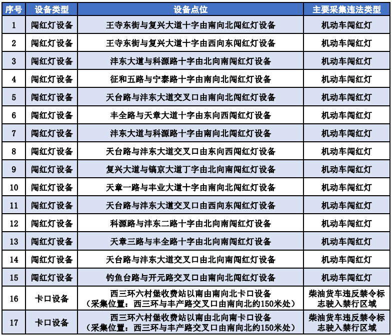 为进一步加强西咸新区重点道路交通管理,优化道路通行环境,预防和减少道路交通事故发生,保障广大人民群众的生命财产安全,根据《中华人民共和国道路交通安全法》、《中华人民共和国道路交通安全法实施条例》等法律法规的有关规定,结合西咸辖区道路交通实际,现决定自2024年6月20日零时起正式启用以下17处违法抓拍取证设备,现将新增道路违法采集点位公示如下: