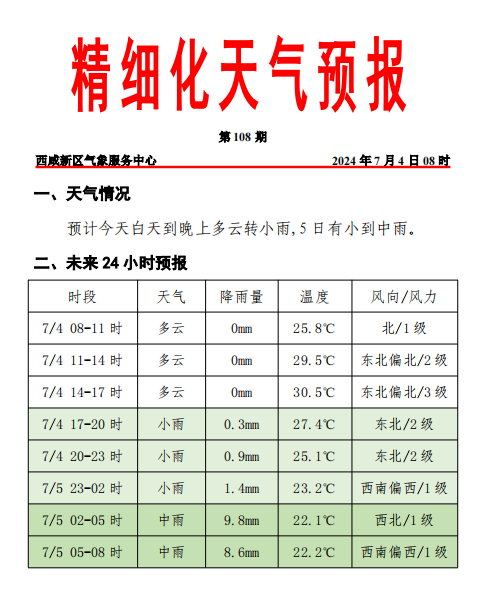 西咸新区气象服务中心2024年7月4日10时发布高影响天气预报:预计今天后半夜到明天白天新区有一次明显的强降水过程,雨量较昨日预报明显调大,预计全区中到大雨,主要降水时段在7月5日凌晨-14时。过程累积雨量20-40毫米,降水期间伴有短时强降水、雷暴和短时大风,最大小时雨强20-30毫米。预计7-10日新区阴雨天气持续,其中7日夜间-8日、10日降水明显,量级以中雨为主。