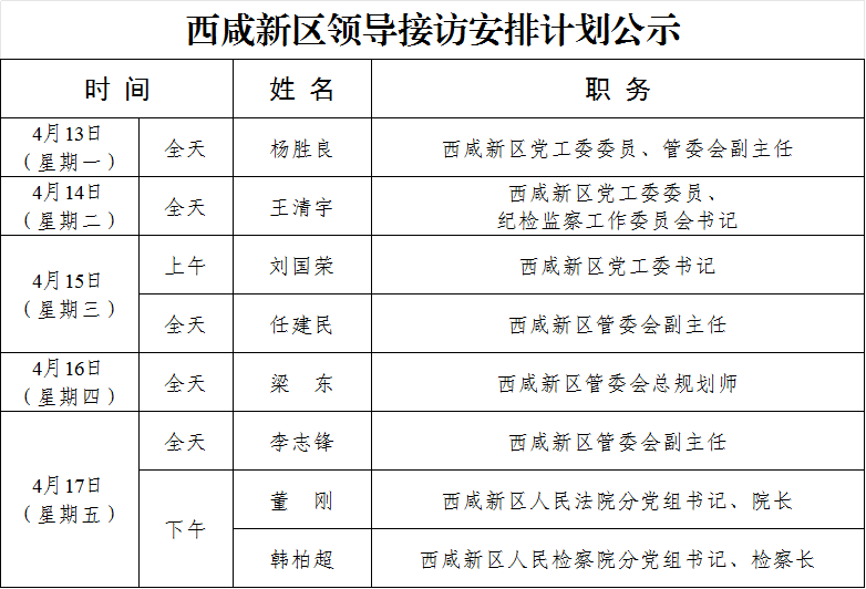 为进一步畅通信访渠道,方便群众及时就地反映诉求、解决问题,现将2026年4月13日-2026年4月17日西咸新区领导接访安排计划公示如下:
