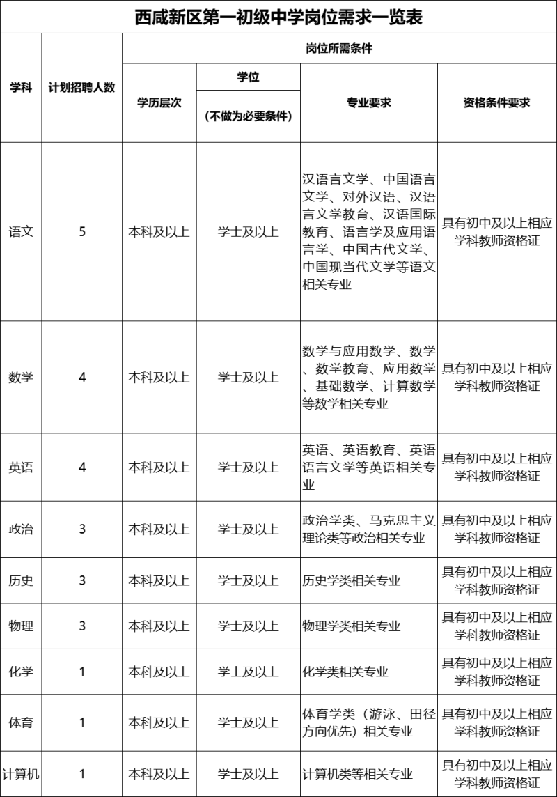 西咸新区第一初级中学岗位需求一览表