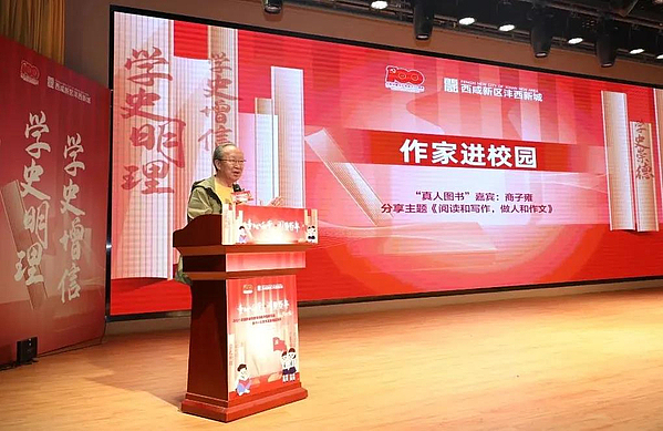 在“作家进校园”环节,“真人图书”嘉宾商子雍老师以“阅读和写作,做人和作文”为题,讲述文艺作品创作背后的故事,传授写作经验。他希望孩子们养成良好阅读习惯,既要读好有形的书,不断提升阅读和写作能力,还要读好无形的书,提升个人境界、完善个人品格。