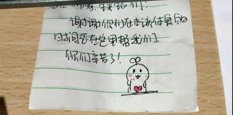 “大可爱们,你们辛苦了!冬天要注意保暖哦,不管多累也要加油,感谢你们前来相助.稳住,我们能赢!”连续几日的核酸采样,还有一件特别让贠景强感动的事,就是在上门到泾华学校为学生检测时,很多学生在看到医护人员的辛苦时纷纷把感谢之情写到字条上,至今想起此事,贠景强说:“看到学生们真诚和鼓励的留言,那一刻,受再多苦也觉着值得了。”