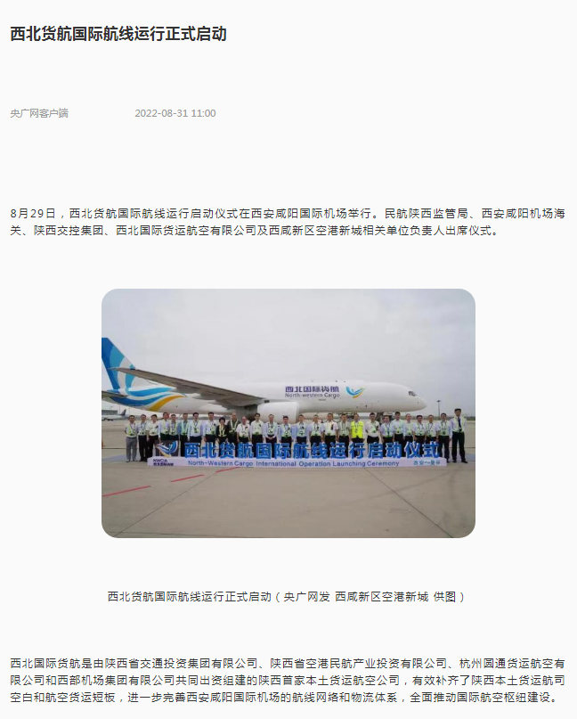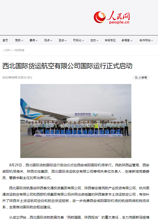 据介绍,西北国际货航是由陕西交控集团、陕西省空港民航产业投资有限公司、杭州圆通货运航空有限公司和西部机场集团共同出资组建的陕西首家本土货运航空公司。此次完成国际首航后,该公司计划9月初开通深圳至越南胡志明市的国际航线,每周执飞3班。