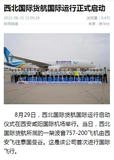 8月29日,西北国际货航国际航线运行启动仪式在西安咸阳国际机场举行。当日,西北国际货运航空有限公司(以下简称“西北国际货航” )所属的一架波音757-200飞机由西安飞往泰国曼谷。这是该公司首次进行国际飞行。