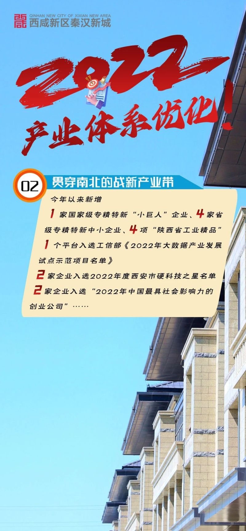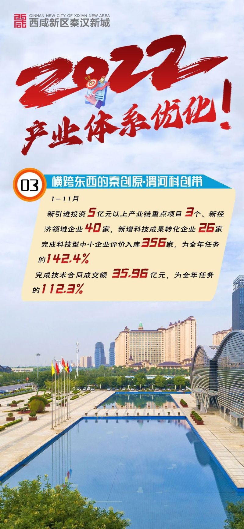 2022年,秦汉新城创新性提出“连接古今的秦汉文化带”“贯穿南北的战新产业带”“横跨东西的秦创原·渭河科创带”整体发展思路,勾画出未来发展的宏阔蓝图,产业体系进一步优化。