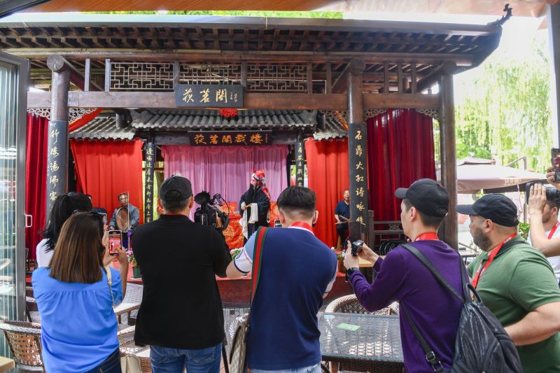 水韵阁茶楼的路上,一声声秦音高亢激昂。只见秦腔演员秀绝活、展身段、甩水袖……一套动作行云流水,赢得记者们连连喝彩。哈萨克斯坦国家电视台编导Aikyn还跟演员学起了动作。她指着演员的戏服,拽起自己的衣角,向周围的中国游客展示身上的民族服装。