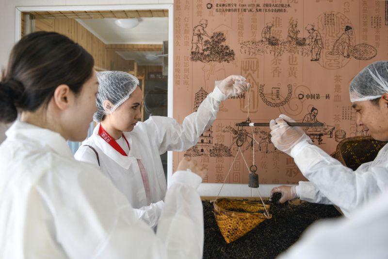来到茯茶小镇,怎么能不亲自体验一下手筑茶?在茯茶手筑体验馆,记者们站在茶锅前,在制茶专家的指点下,手拿炒茶工具,匀速翻茶,通过观察茶颜色来变换翻茶速度。动作有板有眼,像模像样。“我们国家不生产茶叶,大多是进口印度茶。能够亲自体验中国茯茶的制作过程,我非常开心。”哈萨克斯坦国家电视台的记者Akerke Bektas说。
