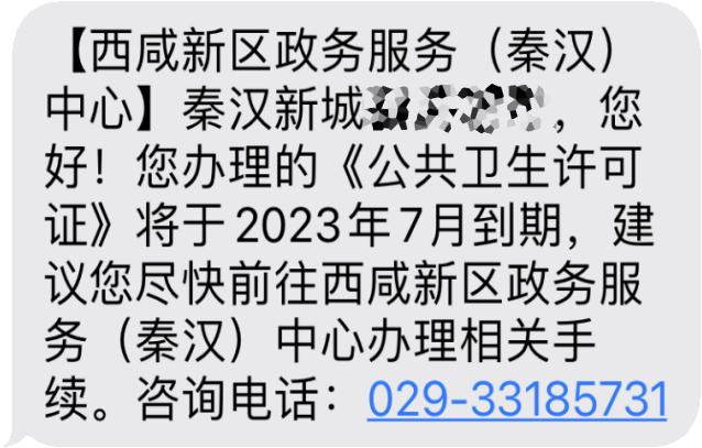 收到短信预警提示后,贺先生立刻拨打96611服务专线咨询相关事宜,工作人员详细告知其办理流程及所需材料。贺先生拿着资料来到政务服务(秦汉)大厅,在工作人员的指导下提交延续换证申请,不到一天时间就拿到了新延续的《公共卫生许可证》。