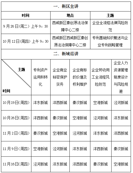 法治培训:通过邀请法官、检察官、律师授课等方式为科创型企业提供经营指导,在接下来每一周都会有不同主题的讲座走进基层,提供定制法律服务培训。(每月最后一个工作日通过“平安西咸”微信公众号发布下月的活动安排,欢迎拨打咨询服务电话029-33186190)。