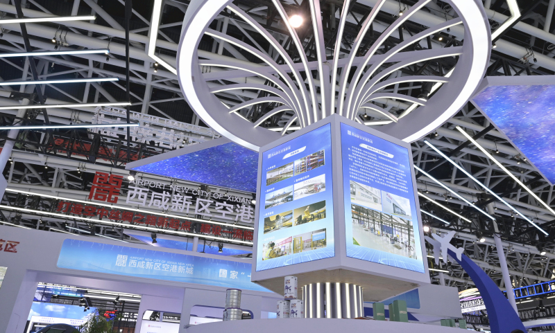 走进西安国际会展中心2号展馆开放平台展区,临空经济示范区和西咸空港综合保税区展区,临空经济特色吸引着来宾参观。