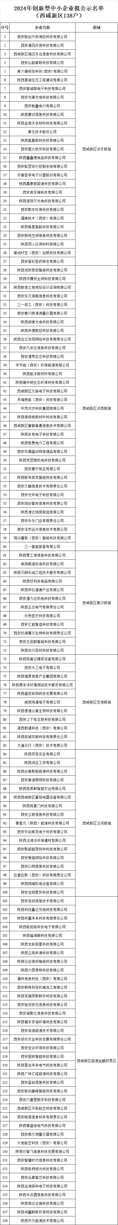 近日,西安市工业和信息化局公布2024年陕西省创新型中小企业拟认定名单,西咸新区138家企业入选。
