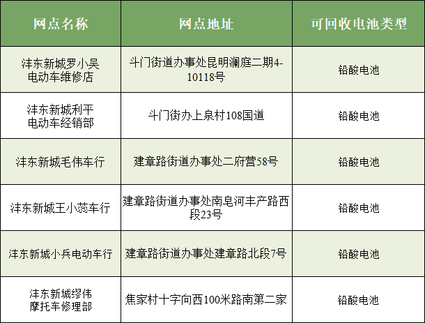 废旧电动自行车电池含重金属,随意丢弃或由无资质主体处置,会渗入土壤、污染水源,破坏生态环境,这也是电动自行车全链条整治中末端管理的重点。请广大居民将废旧电池送至以下具备回收资质的网点,确保废旧电池规范、安全处置。